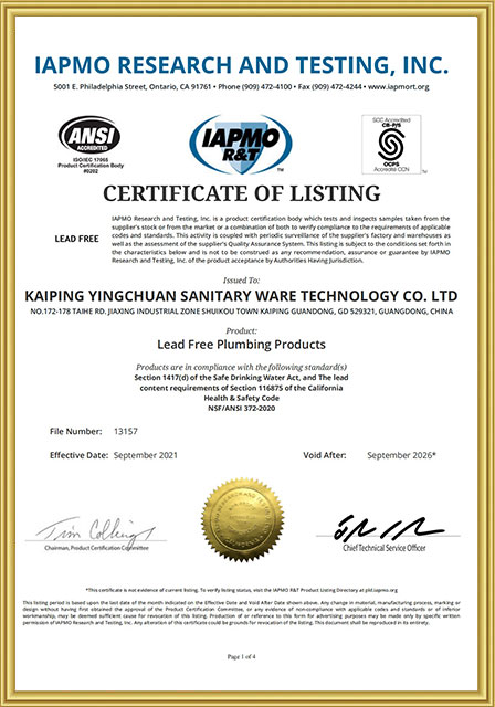 Los productos a través de CUPC, NSF, CE, CEC y otras certificaciones internacionales, garantía de calidad durante cinco años, resistencia y calidad del producto han sido reconocidos por la industria.